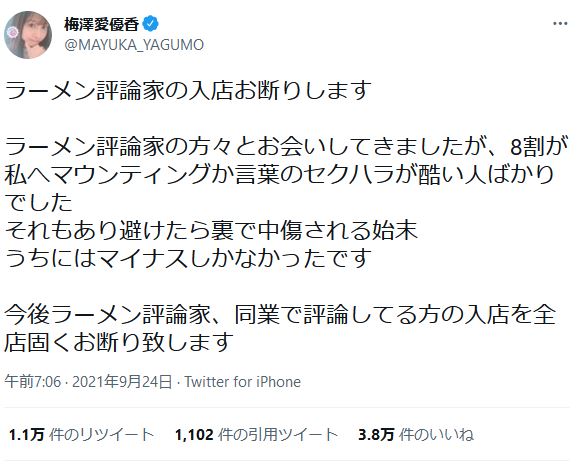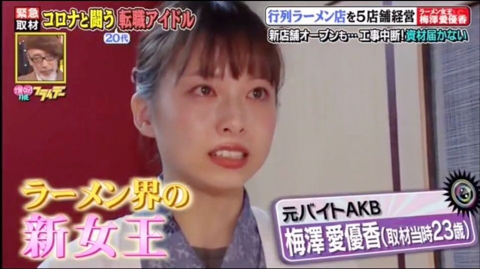「バイトAKB」に所属していた元アイドルで、複数のラーメン店を経営している梅澤愛優香さんが9月24日にTwitterを更新。