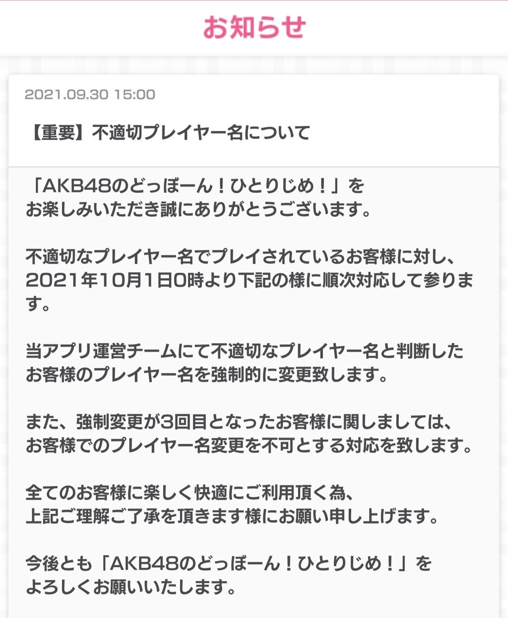 AKB48のドボン運営「不適切なプレイヤー名は排除する」