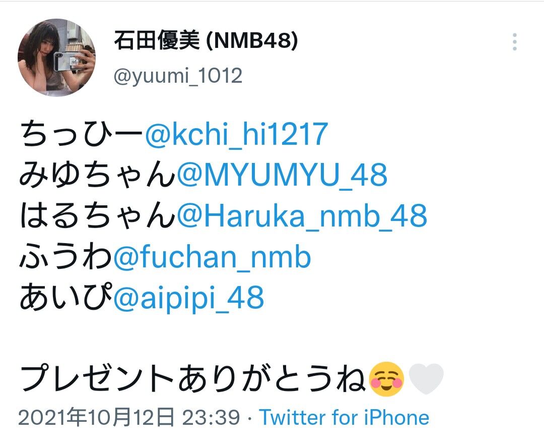 【悲報】NMB48石田優美が誕生日プレゼントをくれたメンバーの一覧をTwitterで公開、、 無言の圧か?