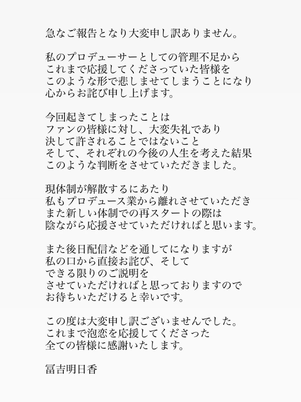 【闇深】冨吉明日香プロデュースアイドル『泡恋』、重大な契約違反が発覚しメンバー脱退し解散!何があった?