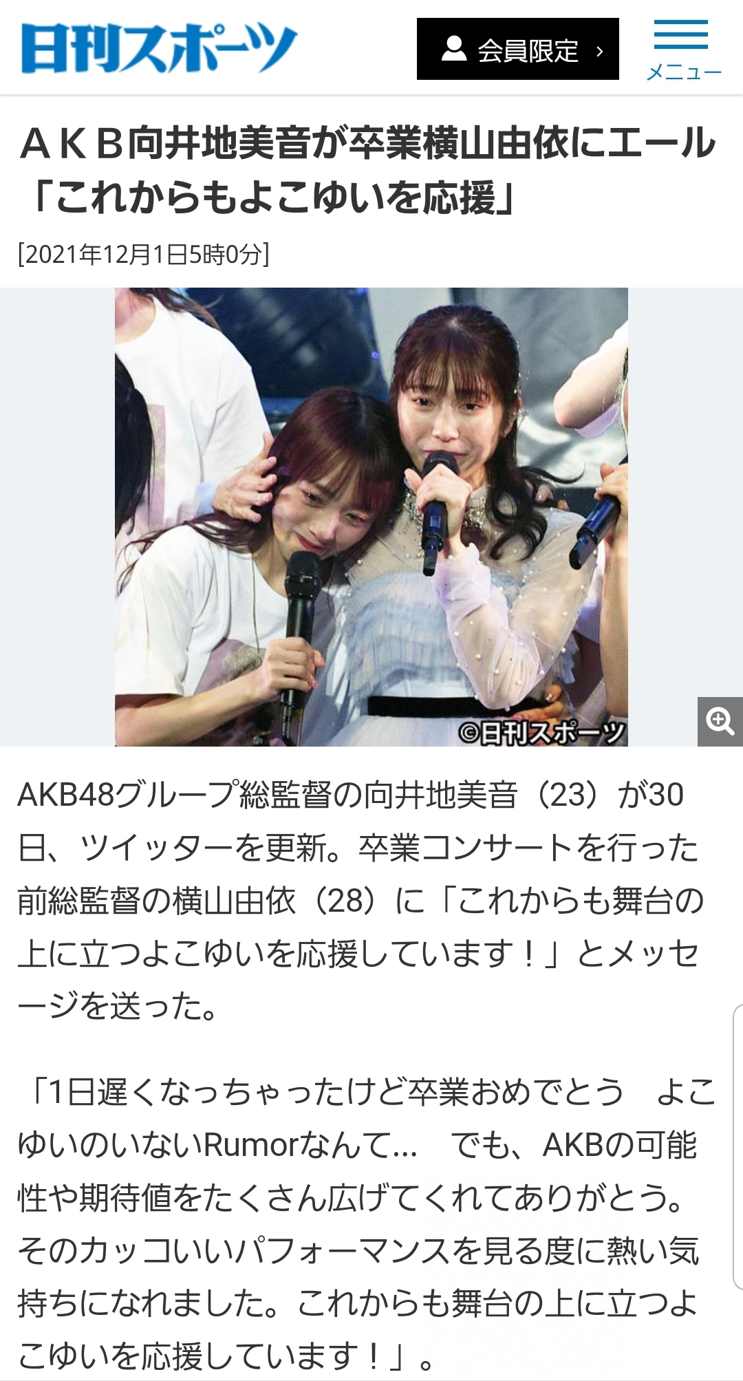 AKB向井地美音が卒業横山由依にエール「これからもよこゆいを応援」