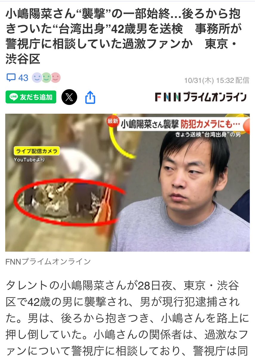 ジャオ容疑者は10月28日に、渋谷区の路上で、イベントを終えて施設から出てきた、小嶋さんに抱きつき押し倒したとして、暴行の疑いで警視庁に現行犯逮捕されていました。