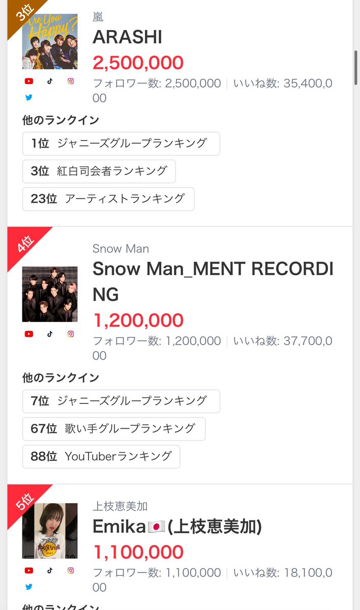 アイドルジャンルのティックトックのフォロワーランキング…