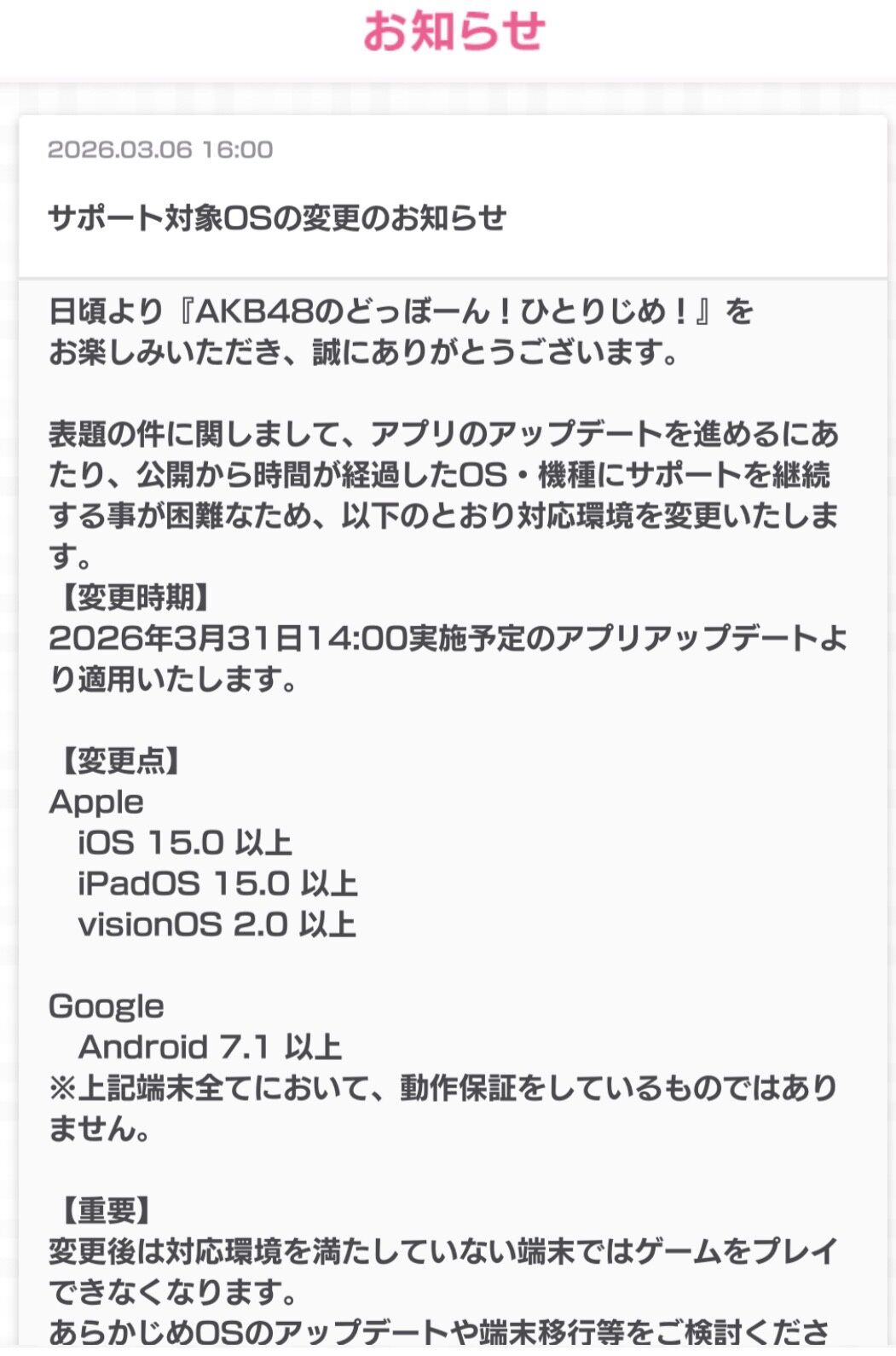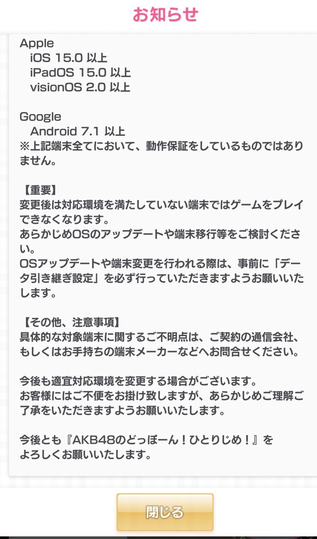 【注意喚起】3/31より、古いスマホやタブレットだと 『AKB48のどっぼーん!ひとりじめ!』 ができなくなります!!