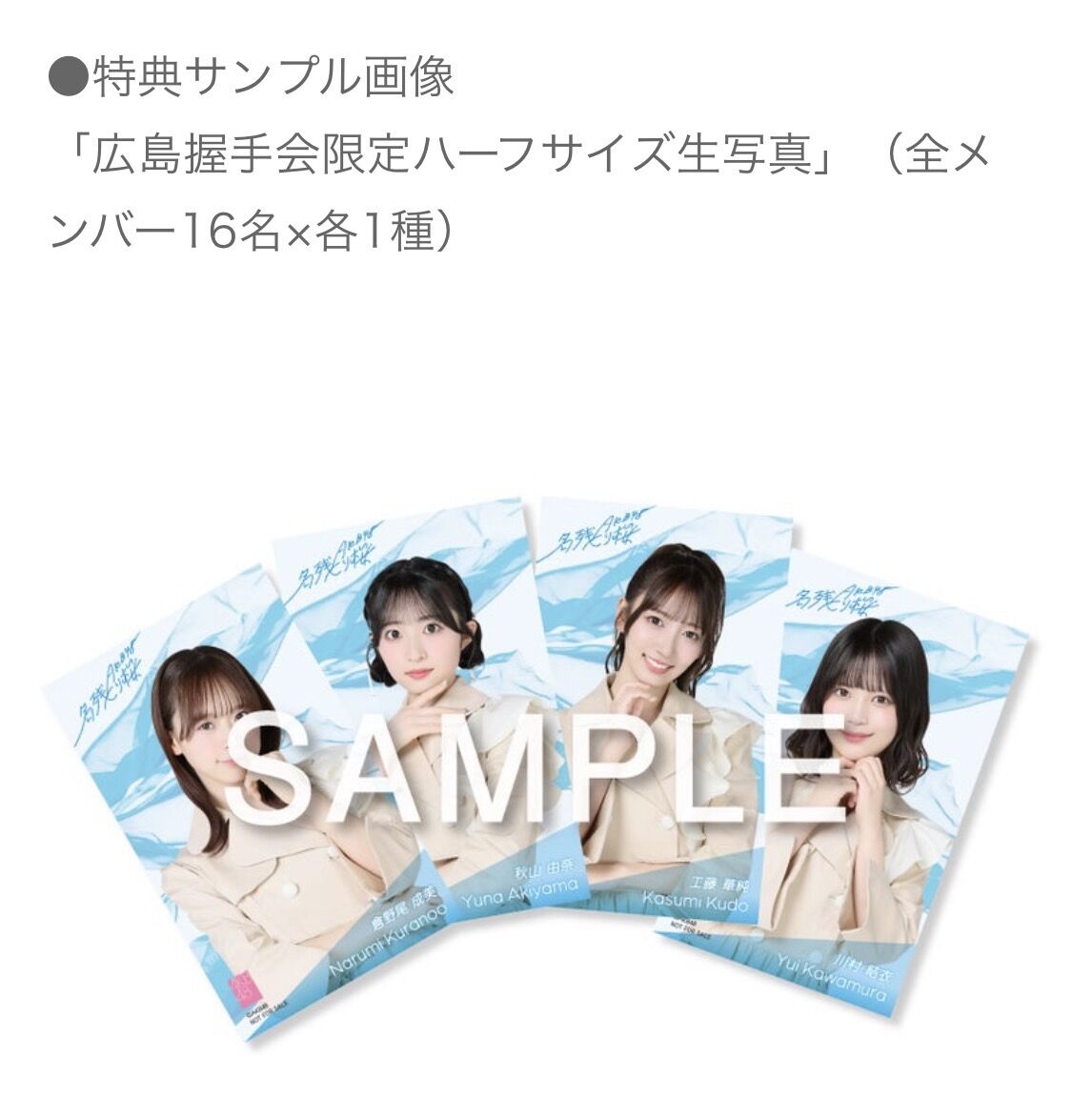 会場にてご購入のお客様に、CD1枚につき「広島握手会限定ハーフサイズ生写真」(AKB48メンバー16名 各1種)をランダムで1枚お渡しいたします。