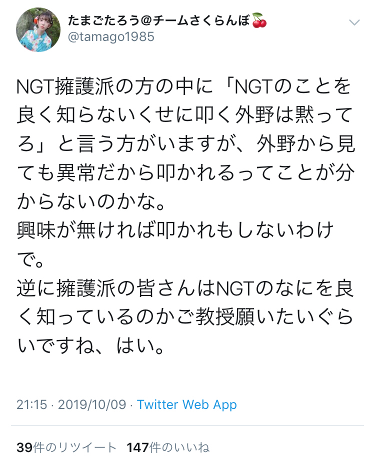 【NGT48暴行事件】NGTオタ「NGTのことを知らない外野は黙ってろと言う方がいますが外野から見ても異常だから叩かれるってことが分からないのかな」