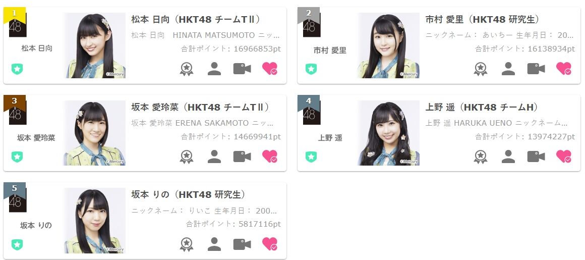 【お知らせ】HKT48×bisイベント最終結果でたよー。1位、松本日向 2位市村愛里 3位坂本愛玲菜