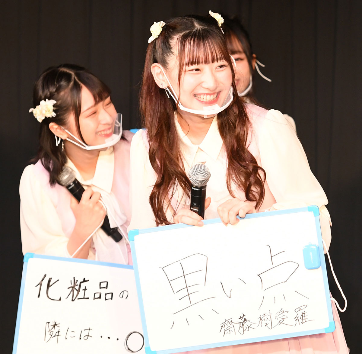 アルバム名にちなんで、メンバーが内緒話を暴露するトークを行った際も芸人魂?を発揮。最年少の齋藤樹愛羅(きあら=16)はボードに「黒い点」と書き、「小学生のころにお尻に違和感があって。人生で初めてお尻を鏡で見たら、お尻の穴の横にホクロがありました!」と告白。これには嶋佐も「そんな話、アイドルとかじゃなく、女の子からも初めて聞いた…」と苦笑いするしかなかった。