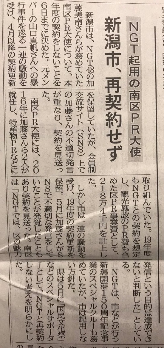 NGT48加藤美南さん新潟市南区のPR大使契約更新されず