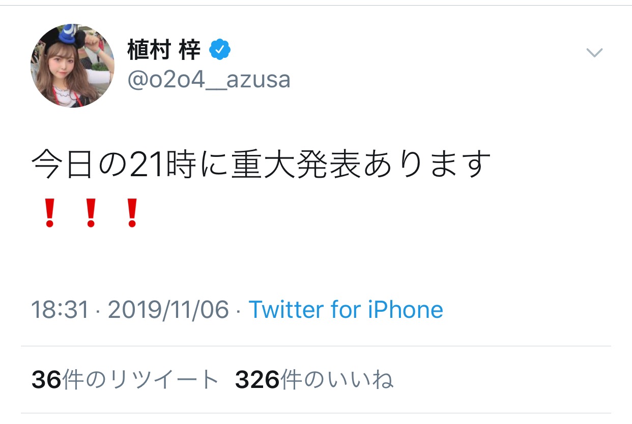 【元NMB48】植村梓「今日の21時に重大発表あります」→「バイトします」wwwwww