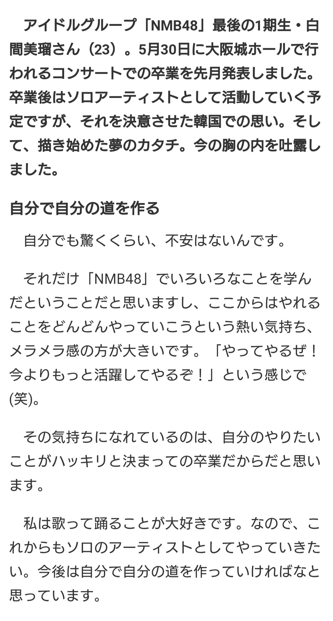 【NMB48】白間美瑠、卒業後はアーティストの道へ進むことを発表 「安室奈美恵さんや倖田來未さんのようになりたい」海外進出も視野