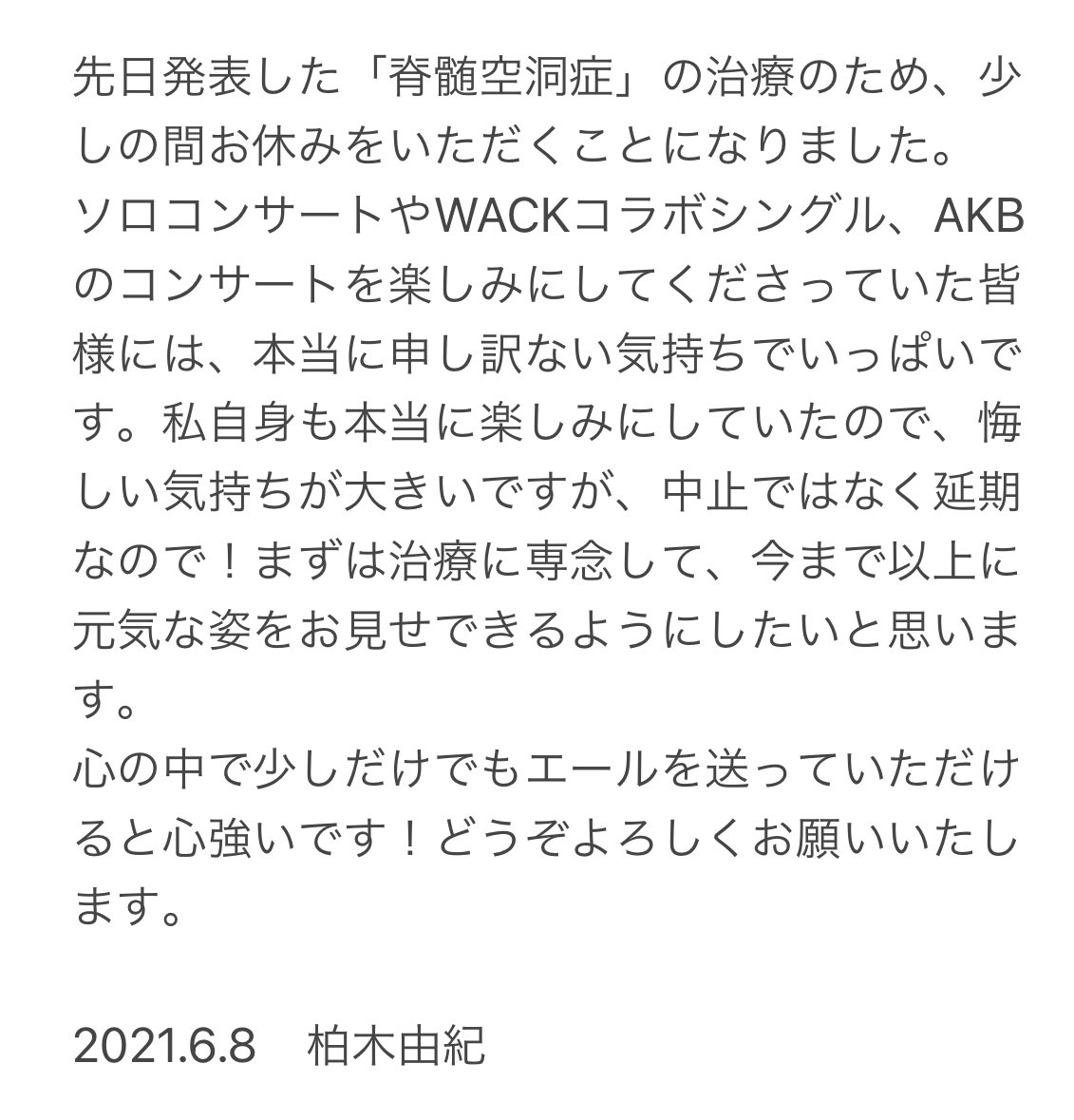 柏木由紀休養のお知らせ