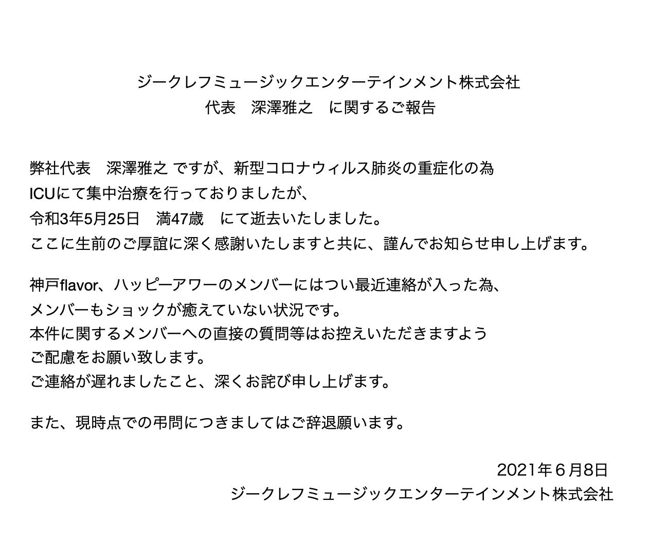 【悲報】47歳アイドルプロダクション社長、コロナで死去