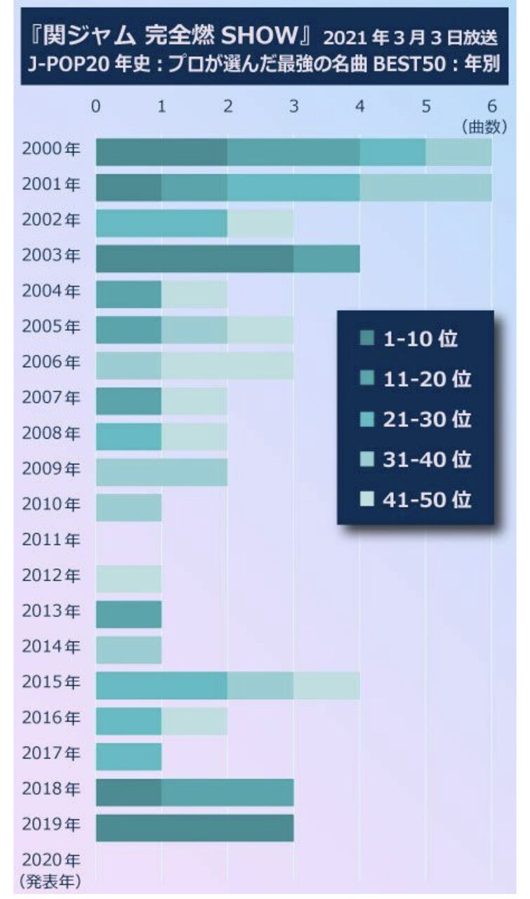 が、リアルタイムで観ているときに、途中から「あれっ?」と感じたひとも少なくないはずだ。なぜなら、00年代中期から10年代中期までの曲があまり出てこなかったからだ。
