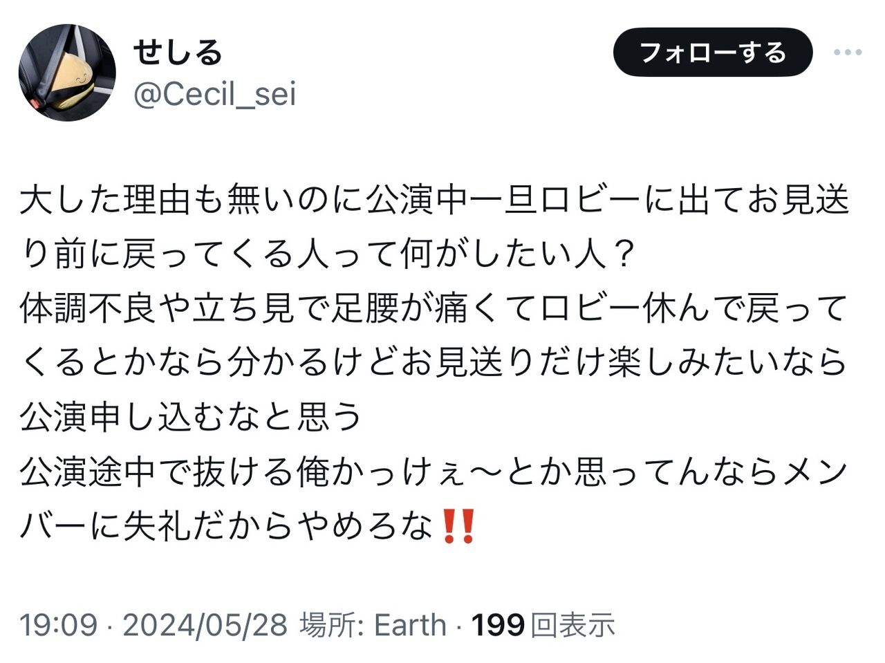 某有名古参ヲタさん「 公演途中で抜ける俺かっけぇ~とか思ってんならメンバーに失礼だからやめろな‼」