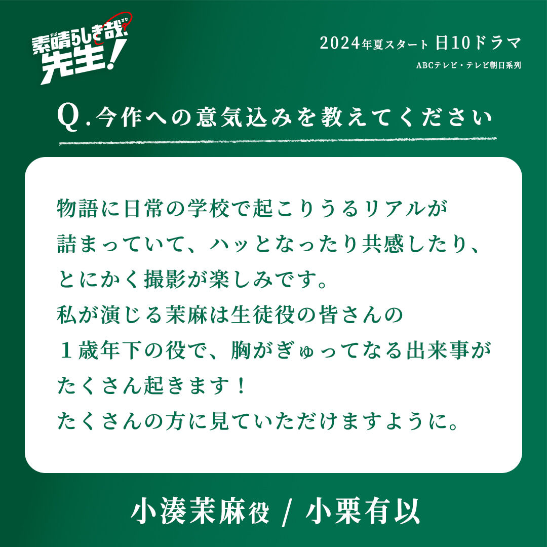 小栗さんは、恋に真っすぐな2年生の女の子・小湊茉麻を演じます。