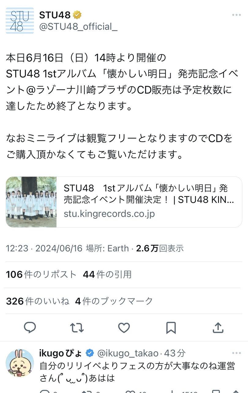 1: 名無し48さん 警備員[Lv.6][新芽] (7級) 2024/06/16(日) 14:39:23.11