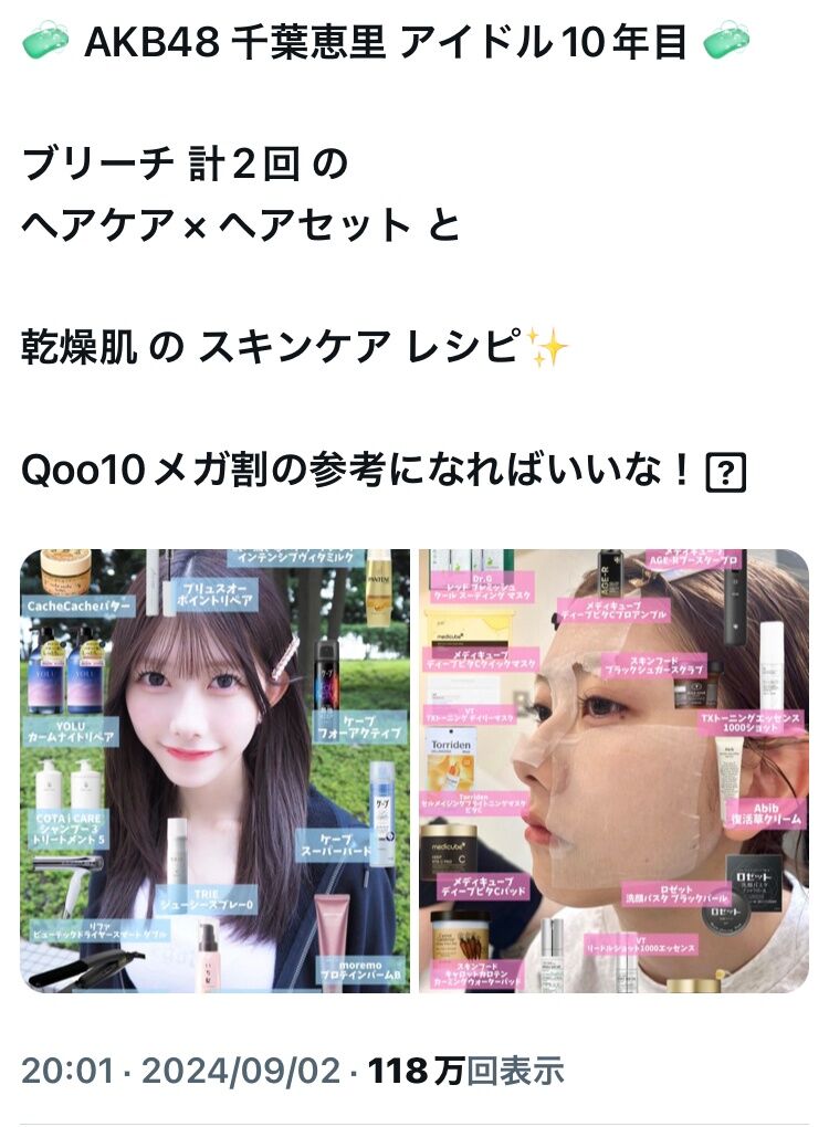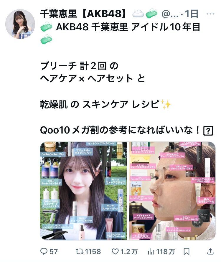 【朗報】平田侑希のメイクレシピに続き、千葉恵里はスキンケアレシピで 万バズしてしまう!!【AKB48】