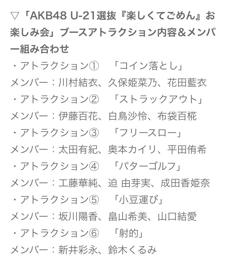 【朗報】「AKB48 U-21選抜『楽しくてごめん』お楽しみ会」ブースアトラクション内容&メンバー組み合わせ発表【東京握手会】