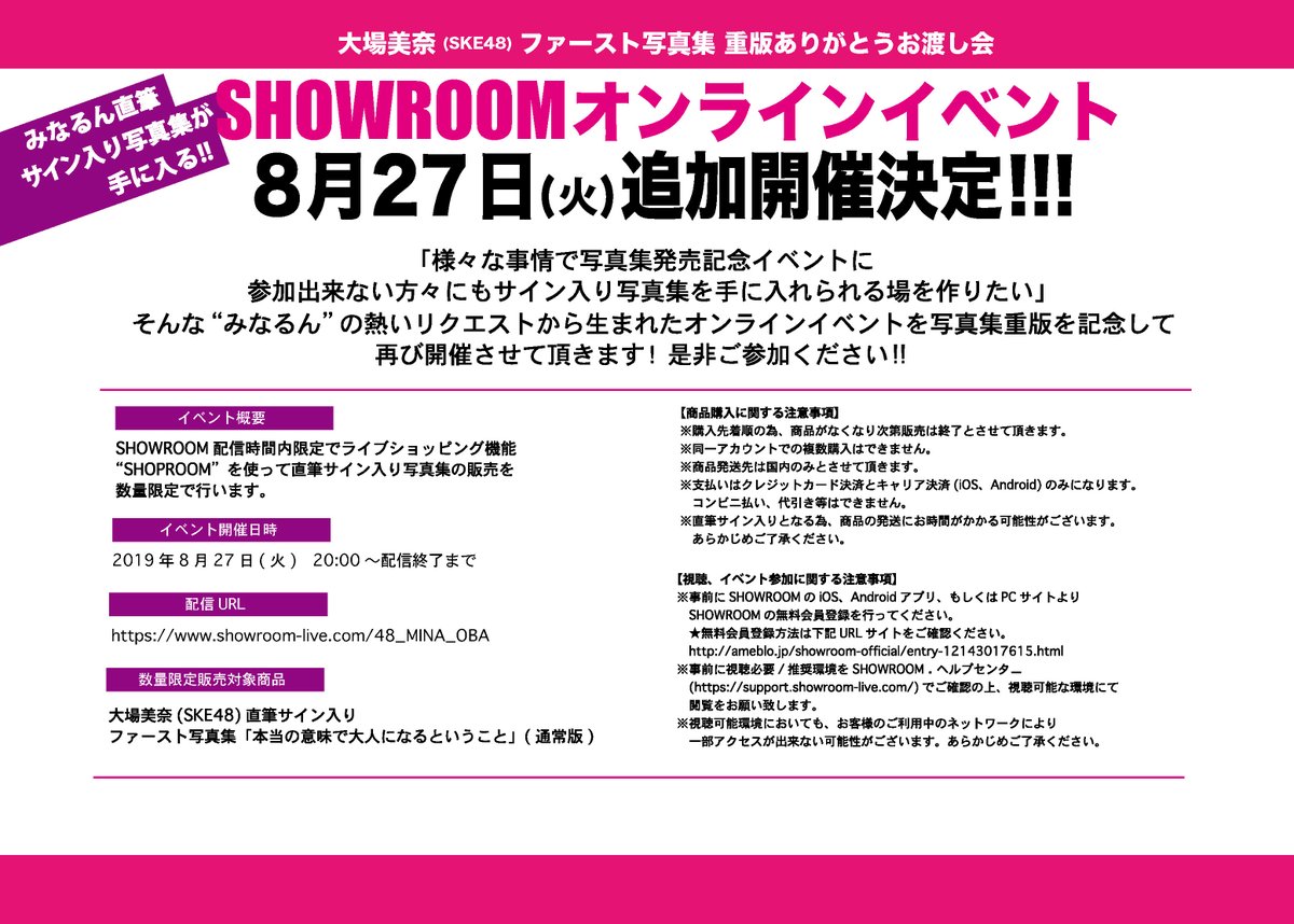 詳細はアップ画像をご確認頂けますと幸いです。#大場美奈#みなるん写真集#大人みなるん#本当の意味で大人になるということ pic.twitter.com/knZyvMVhBn— SKE48大場美奈1st写真集 重版決定!【公式】 (@oba_first) August 25, 2019