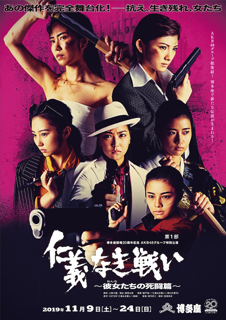 AKB48グループが11月9日から福岡・博多座で上演する博多座開場20周年記念 AKB48グループ特別公演 第一部『仁義なき戦い~彼女(おんな)たちの死闘篇~』のメインビジュアルが8日、公開された。昭和映画史に燦然と輝く任侠映画の傑作に、平成の戦国時代を生き抜き、令和でも戦うアイドルたちが体当たりで挑む。『仁義なき戦い~彼女(おんな)たちの死闘篇~』メインビジュアル(上段左から)横山由依、岡田奈々 (中段左から)田中美久、白間美瑠、瀧野由美子 (下段)本間日陽(略)▽斉藤真木子(SKE48) …山守義雄役