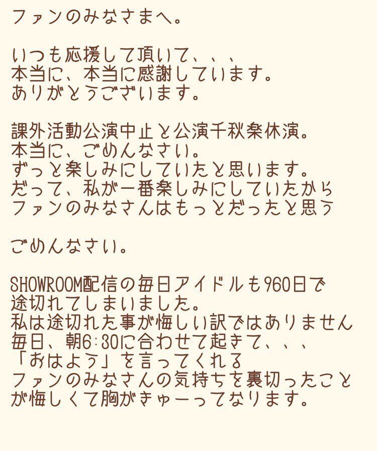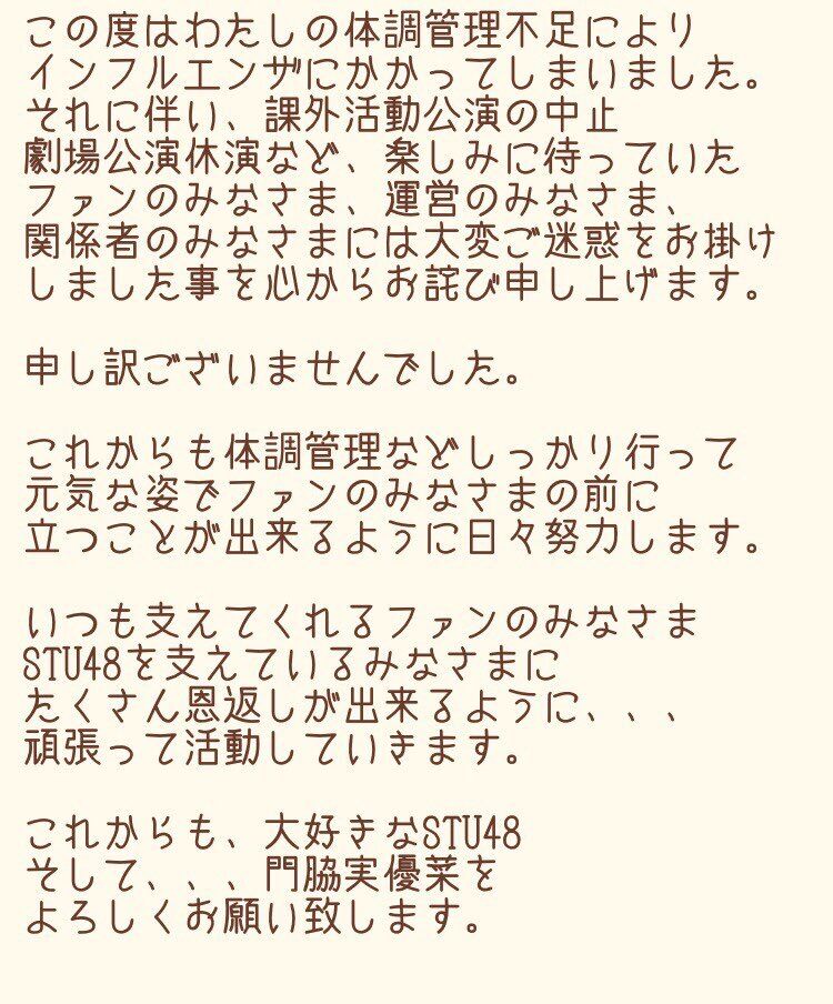 【悲報】STU48 門脇実優菜が謝罪 「私の体調管理不足でインフルエンザになり、公演が中止になってしまった…ファンを裏切り申し訳ない」