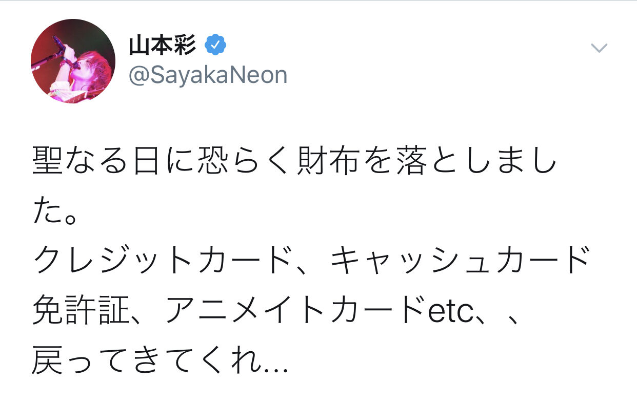【悲報】山本彩さんクリスマスに財布を落とす