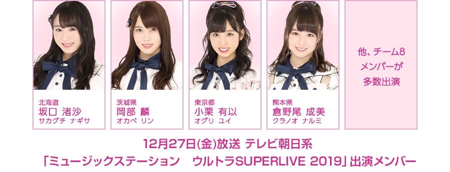 12月27日(金)12:00からテレビ朝日系で放送される「ミュージックステーション ウルトラSUPERLIVE 2019」に、AKB48として、坂口渚沙、岡部麟、小栗有以、倉野尾成美 他、チーム8メンバーが多数出演します!
