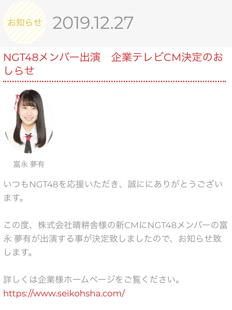 この度、株式会社晴耕舎様の新CMにNGT48メンバーの富永 夢有が出演する事が決定致しましたので、お知らせ致します。