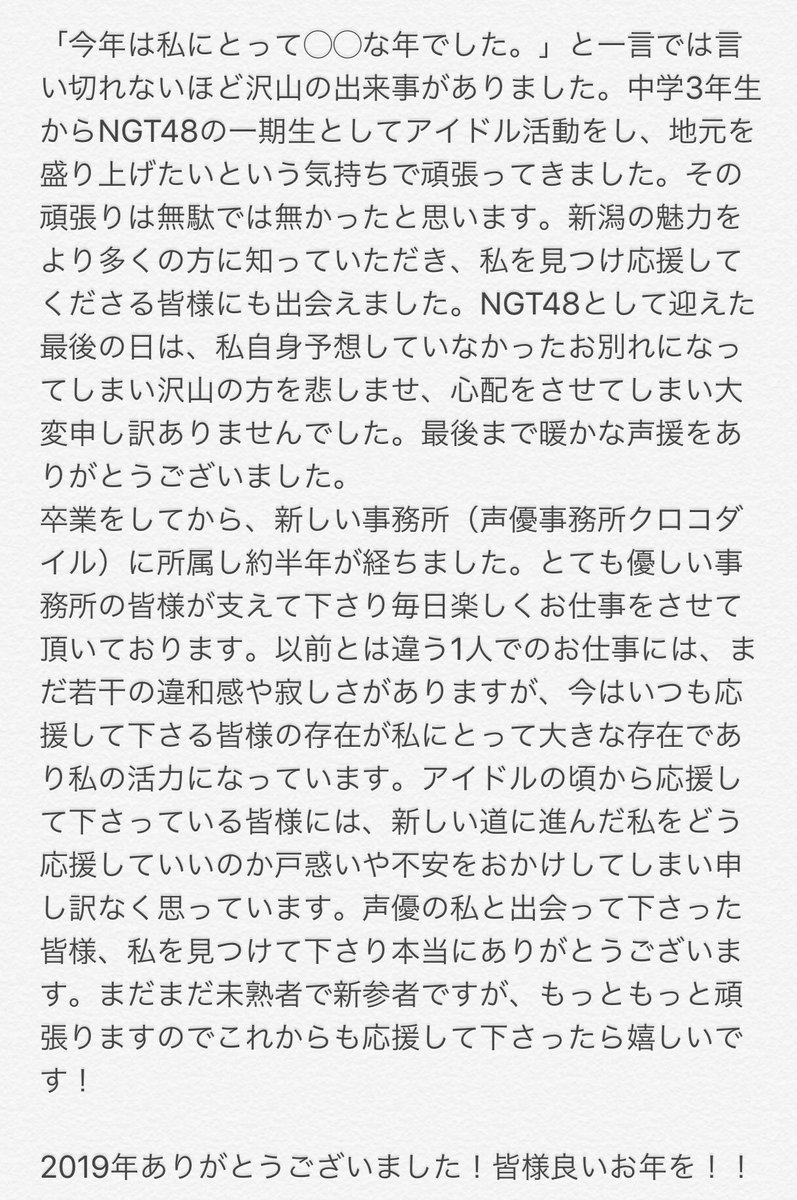 長谷川玲奈「NGTとして迎えた最後の日は、私自身予想してなかったお別れになってしまい、申し訳ありませんでした」