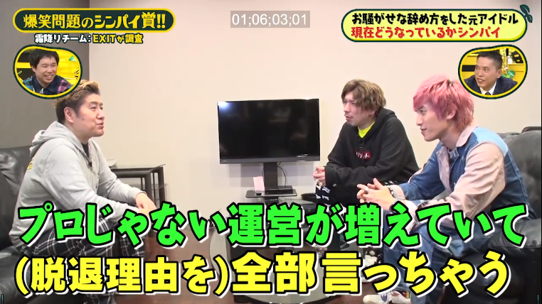 今週金曜のシンパイ賞完成。EXITさんは「変な辞め方をしたアイドル、やめた後グダグダになってないか」心配ロケに。