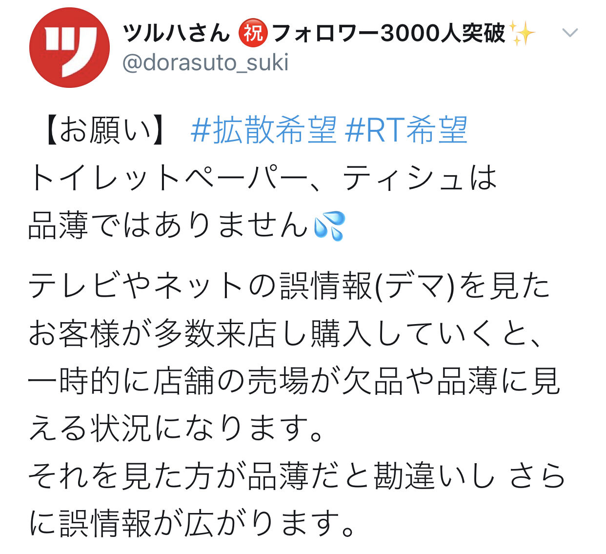 ドラッグストア店員「テレビのデマに煽られてトイレットペーパーを買い占めないでください」