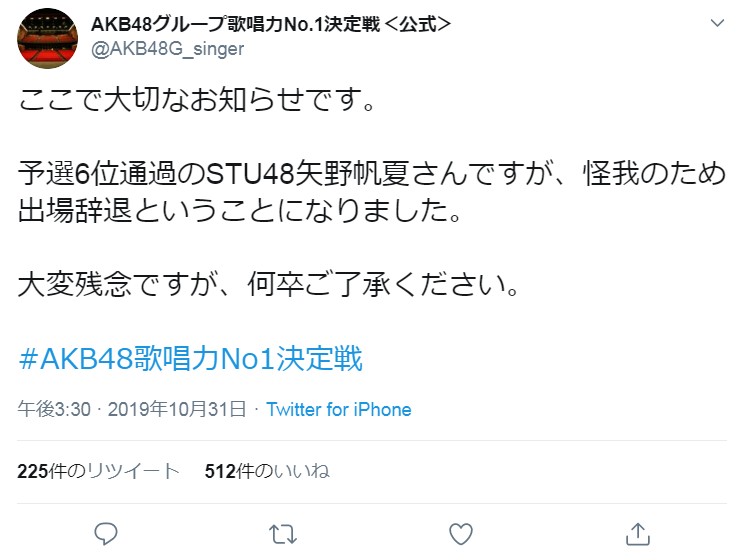 【悲報】STU48矢野帆夏、怪我のため歌唱力No. 1決定戦出場辞退・・・【ほのたん】