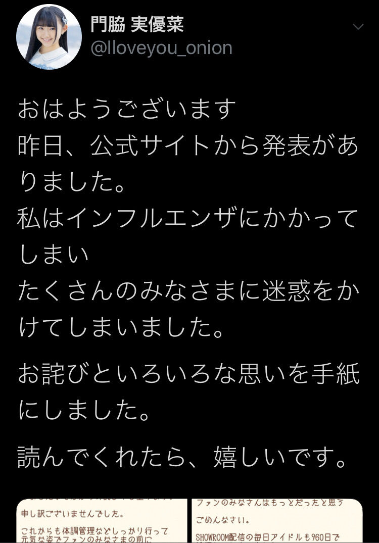 STU48門脇実優菜が謝罪「私の体調管理不足でインフルエンザになり、公演が中止になってしまった…ファンを裏切り申し訳ない」【STU/瀬戸内48みゆみゆ】